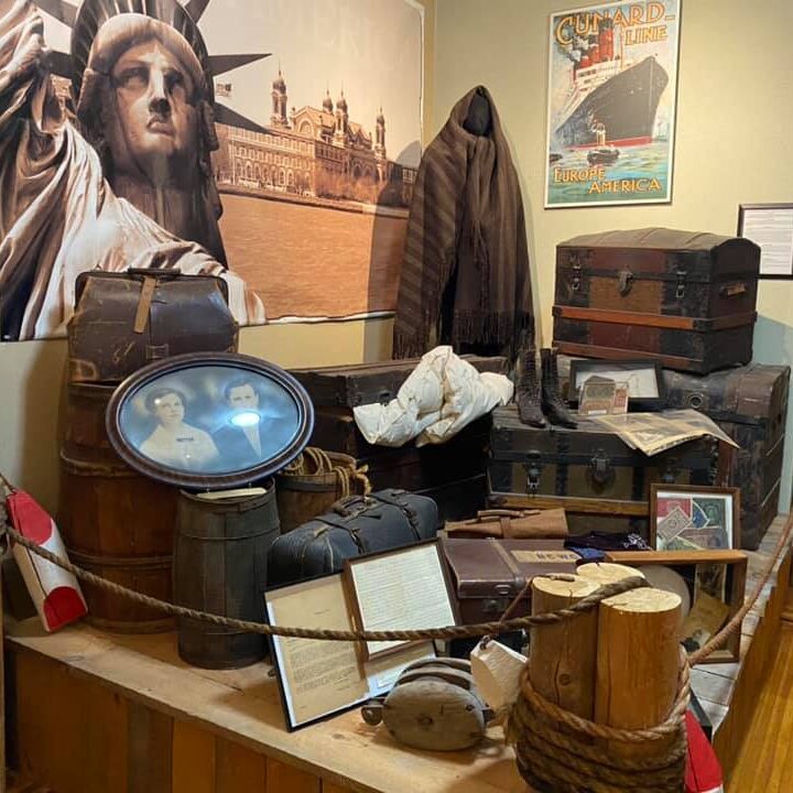 This exhibit room is where the tour of the Center begins. The room shares the experiences and objects that immigrants brought with them. This photo shares various trunks, including a sampling of personal items, photos, dinnerware, utensils, etc. There are many interesting stories in this room.